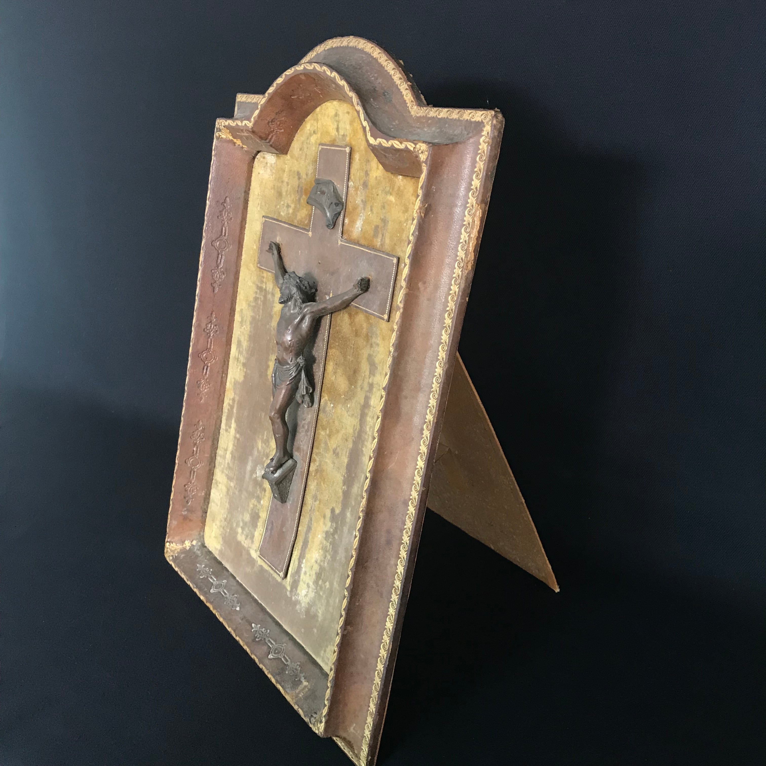 イエスキリストとINRIの罪状書は金属で施されており、フレーム、十字架はエンボス加工された皮革で仕上がっております。