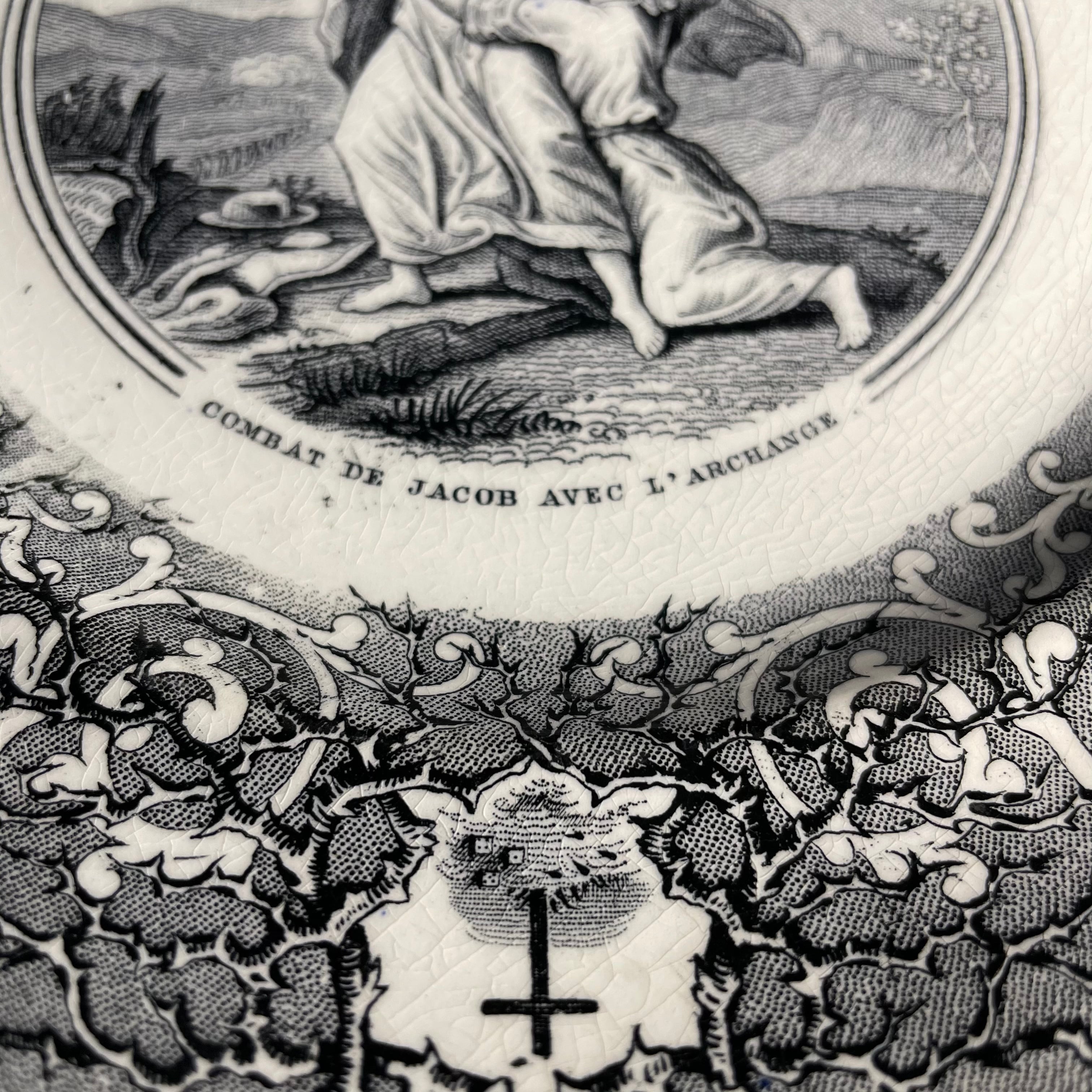このプレートのテーマは旧約聖書『創世記』32章の場面から信心深いシーンがグリザイユ画法によって描かれています。Porcelaine, Bordeaux Poterie, D. Johnson Gres"によるバックスタンプがあります。