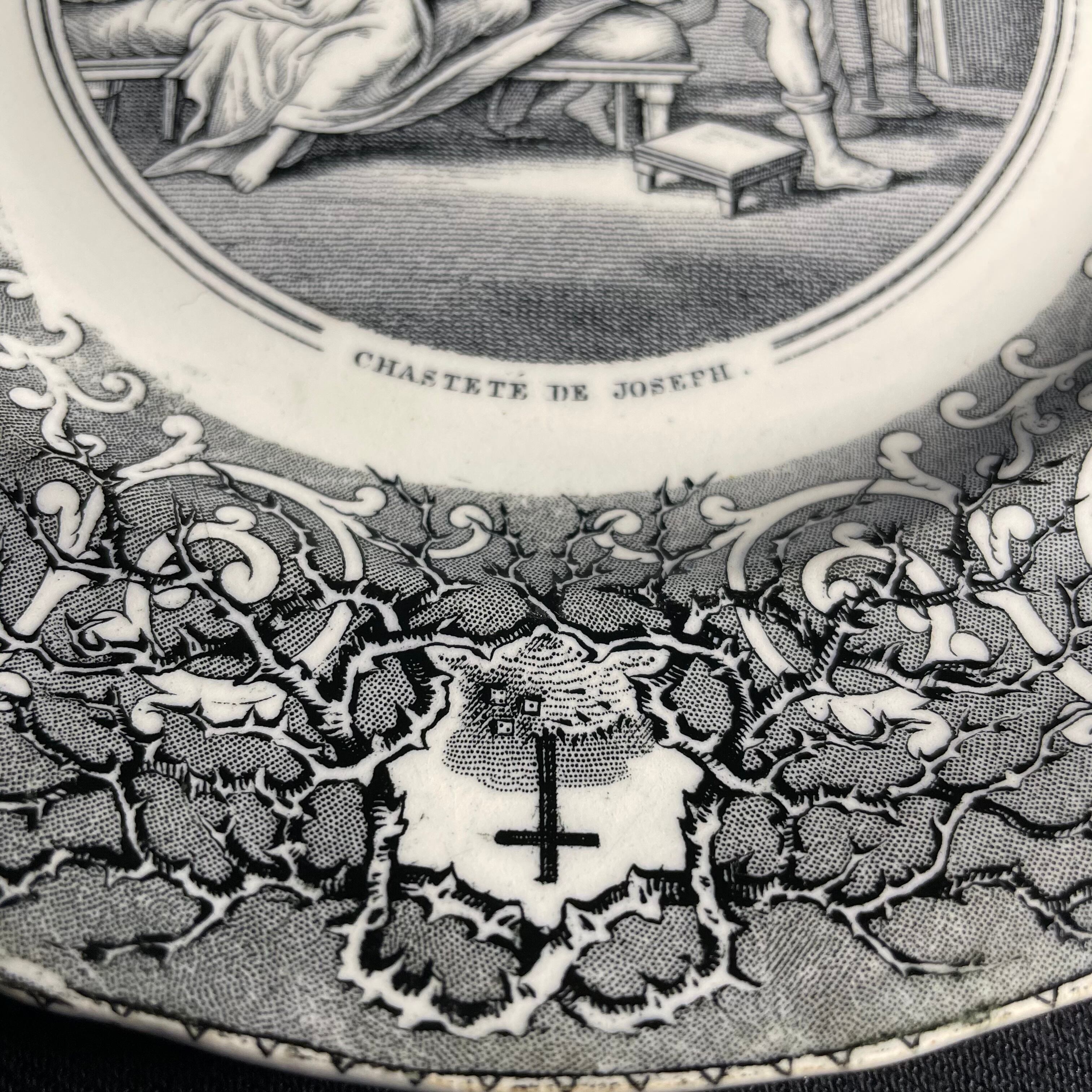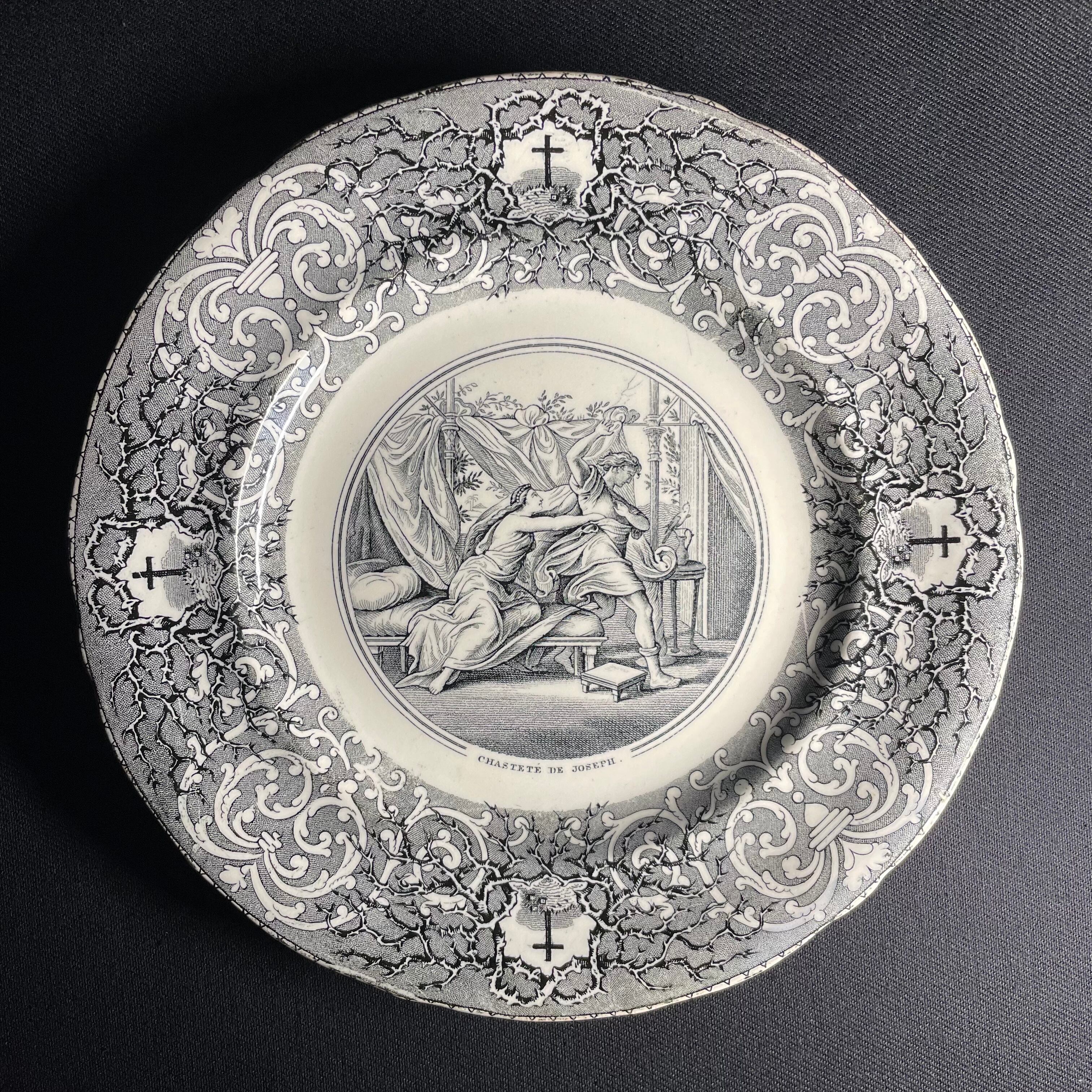 このプレートのテーマは旧約聖書『創世記』39章の場面から信心深いシーンがグリザイユ画法によって描かれています。Porcelaine, Bordeaux Poterie, D. Johnson Gres"によるバックスタンプがあります。