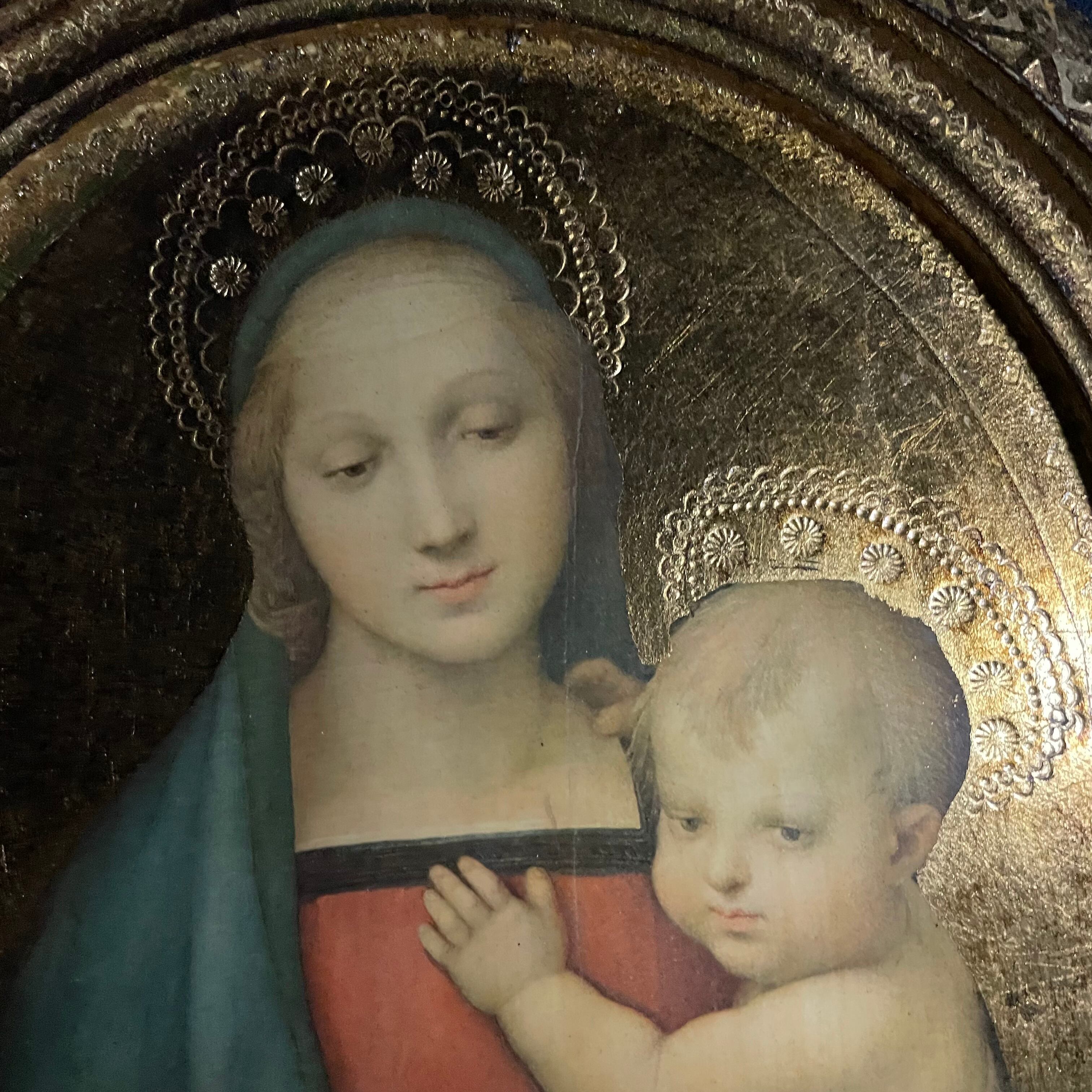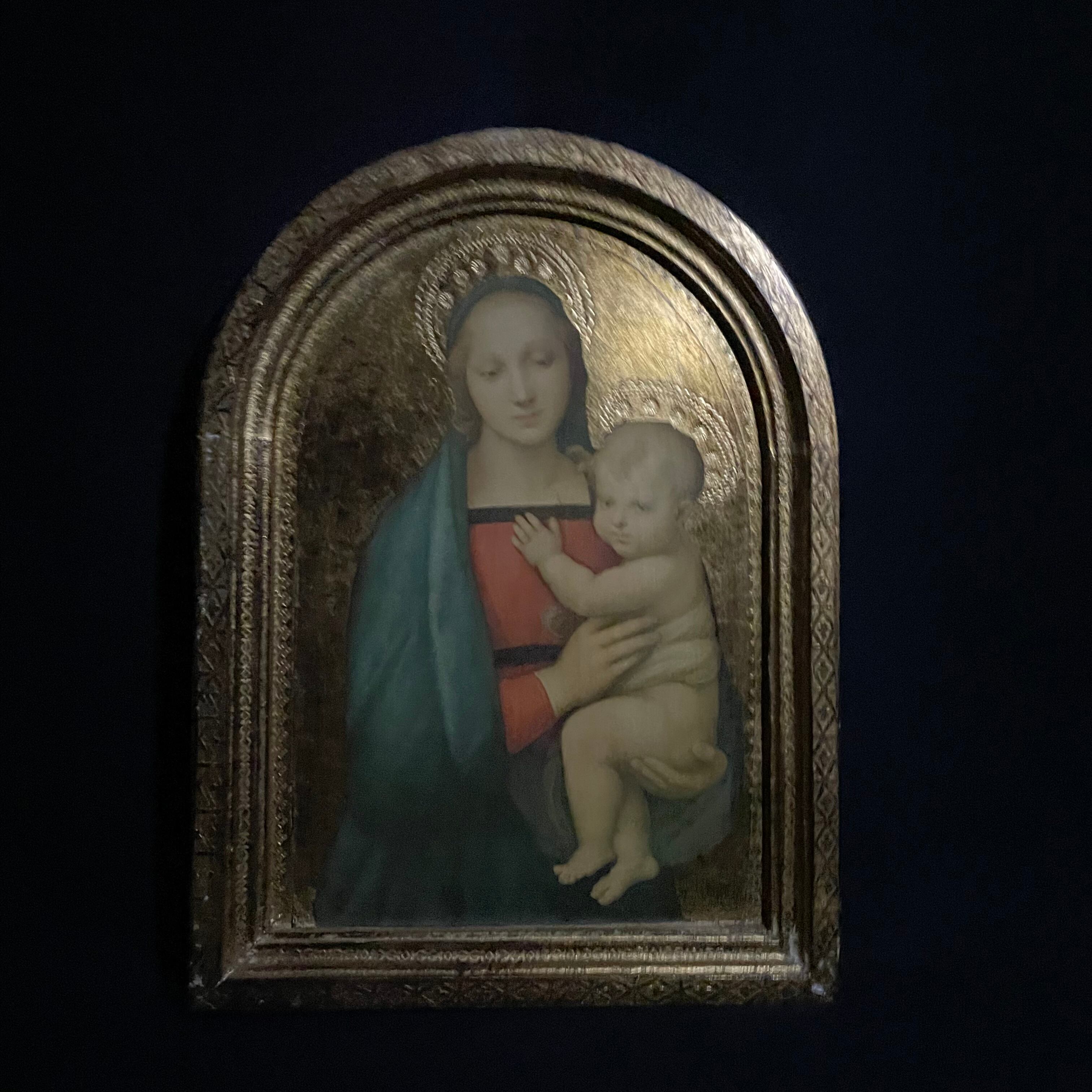 その後、ラファエロではない加筆により黒く塗りつぶされたと科学調査の結果が発表されました。(母子像が描かれている絵の具と違うもので黒く塗りつぶされた)